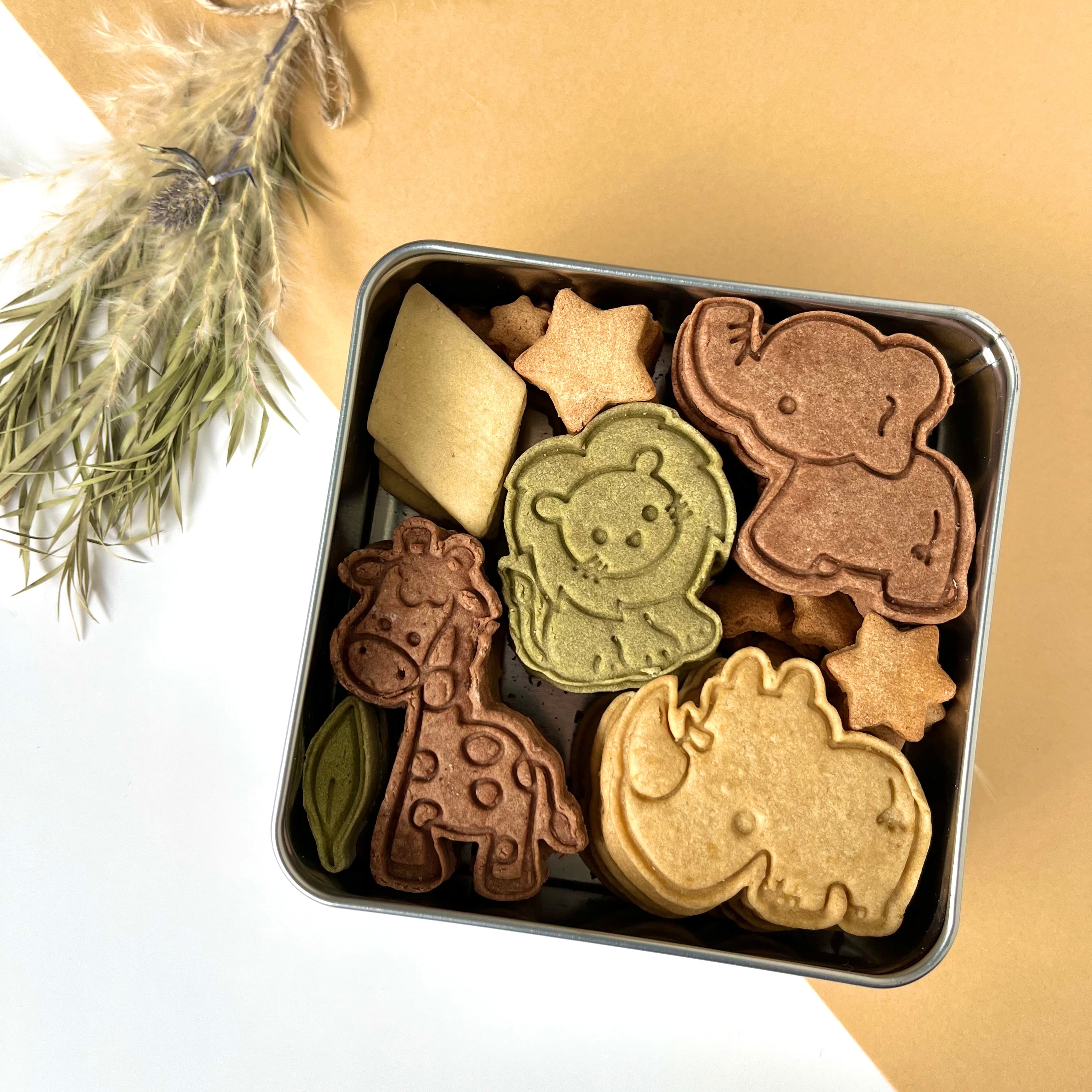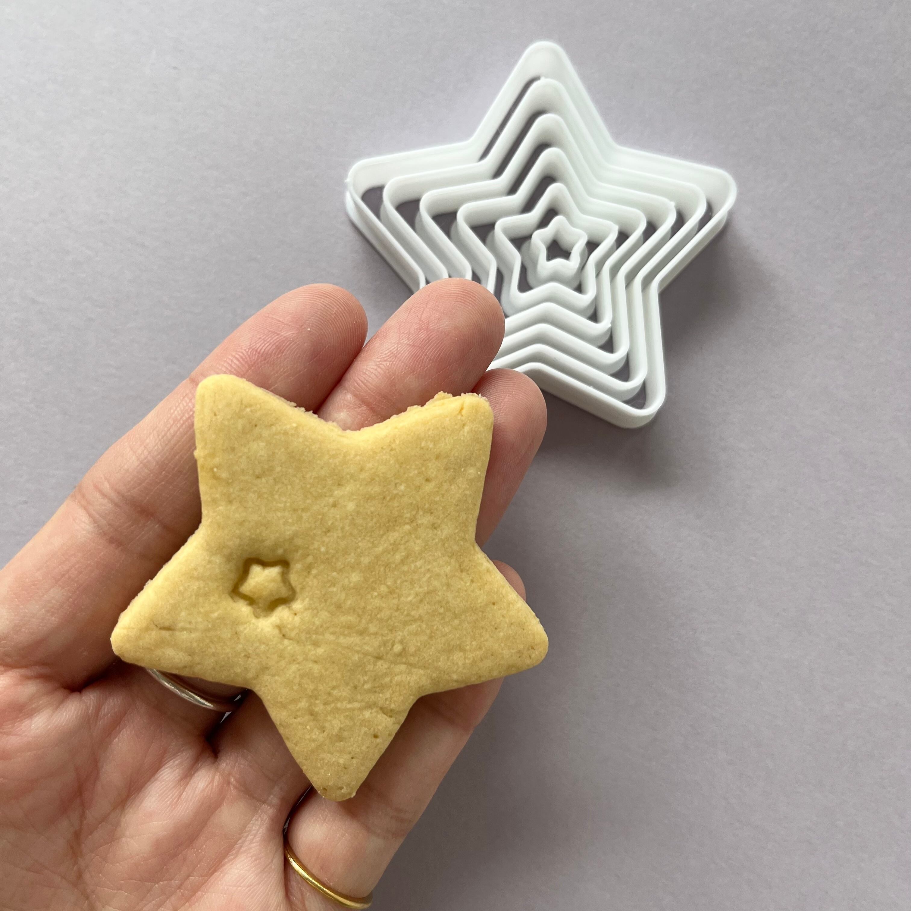 1番小さなクッキーは型を抜くにはかなり難しいので、2番目に小さな星のクッキーの型を抜く際の押し出しスタンプとして、または写真にもあるように星の模様をつけるスタンプとしてお使いいただくのがベストかと思います^ ^
